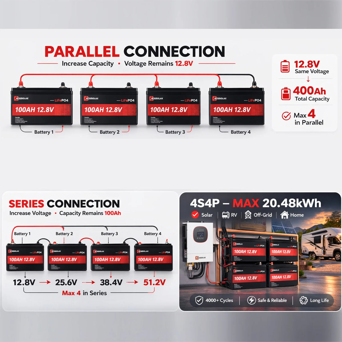 ECG 12.8V 100Ah LiFePO4 lithium battery supports flexible battery expansion with up to 4 batteries in series and 4 batteries in parallel.