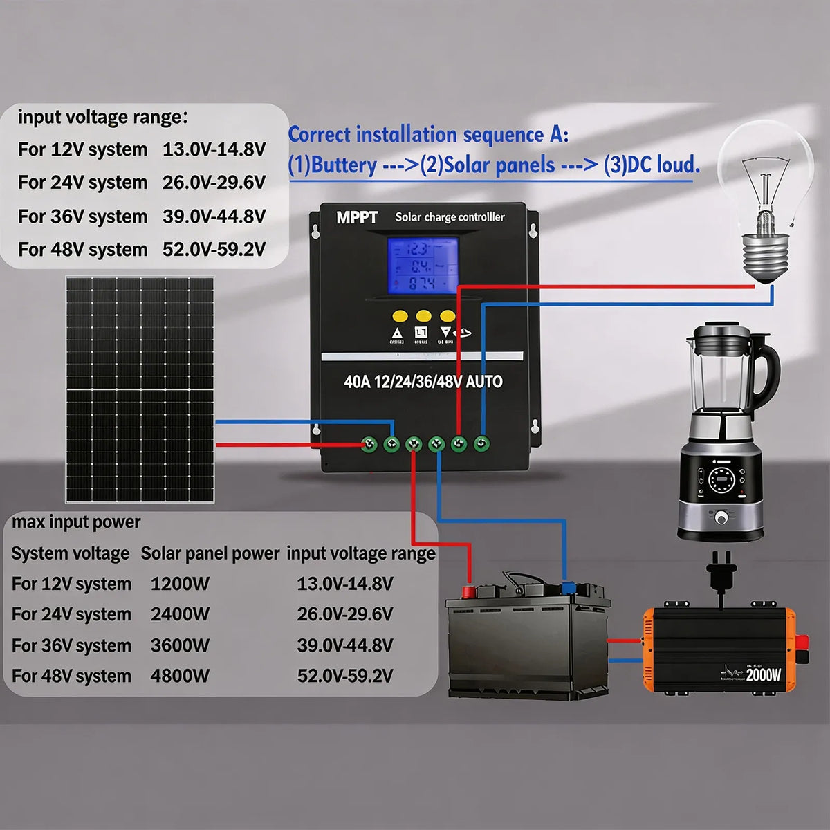 • 4-Level Auto Voltage Detection: Intelligent MPPT Solar Controller that automatically recognizes 12V, 24V, 36V, and 48V battery configurations.