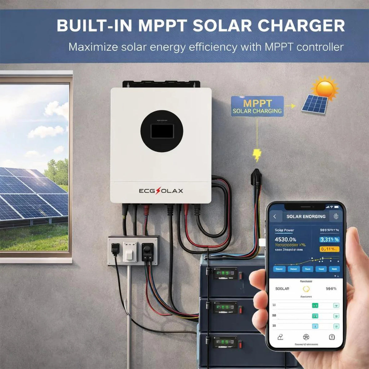 The inverter features a built-in MPPT solar charge controller that maximizes solar energy harvesting and improves charging efficiency. It intelligently tracks the optimal power point of solar panels to ensure stable and efficient battery charging for residential solar energy systems.
