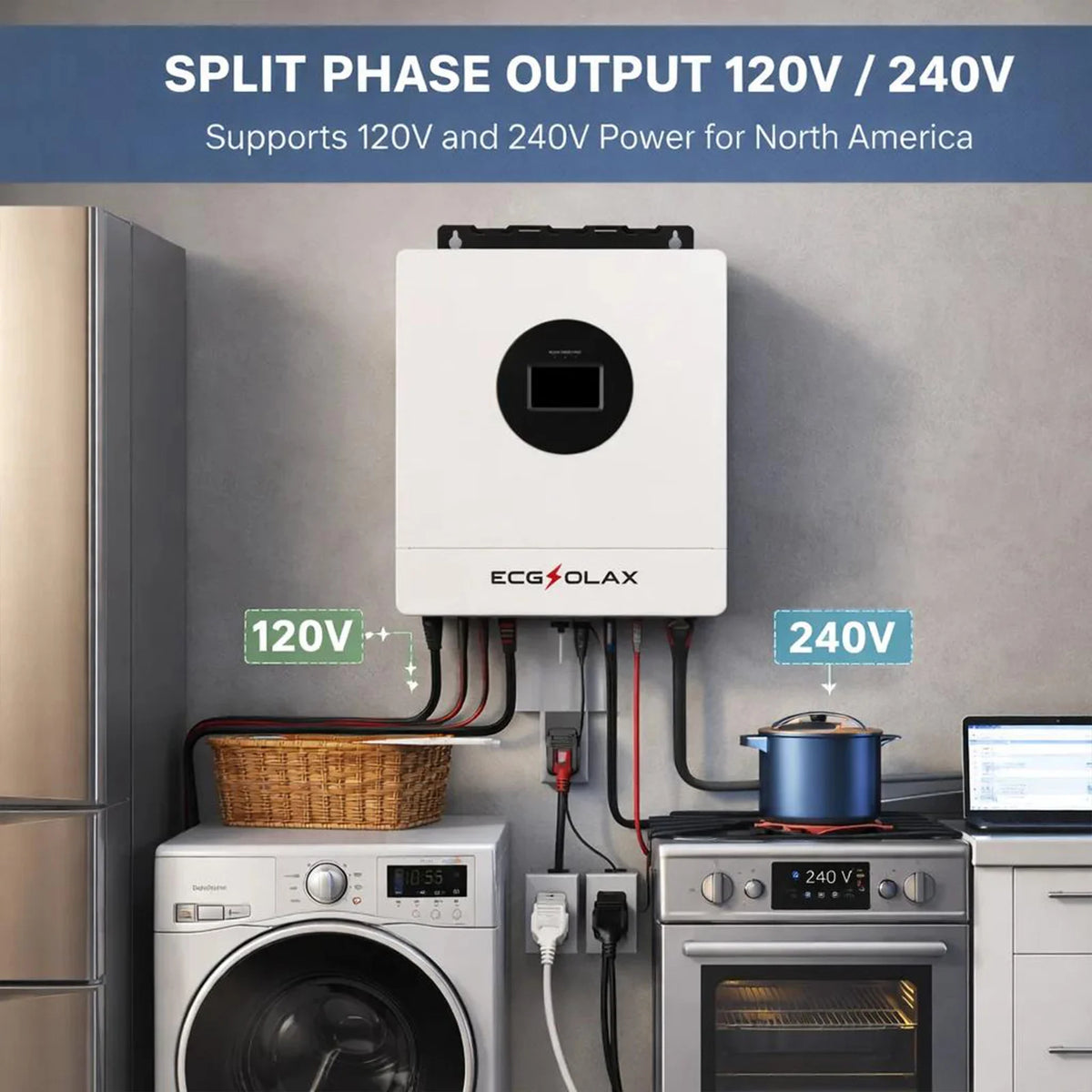 Designed for North American residential power systems, the inverter provides split phase 120V and 240V output, allowing it to power both standard household appliances and high-power equipment. It is ideal for home solar energy systems, off-grid power solutions, and backup power applications.