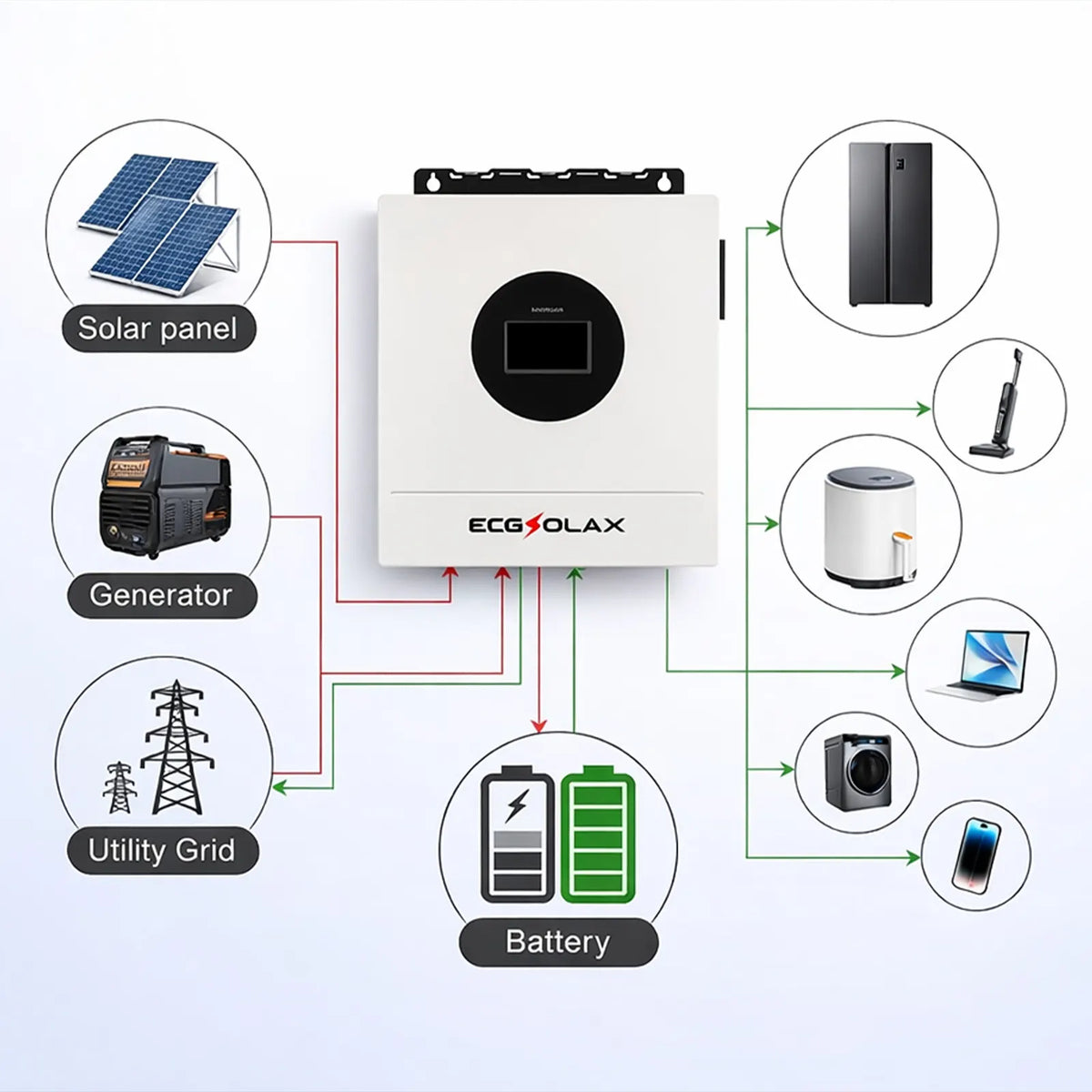 The hybrid solar inverter supports multiple power sources including solar panels, utility grid, generators, and battery storage. It intelligently manages energy flow to ensure stable and continuous power supply for household appliances.
