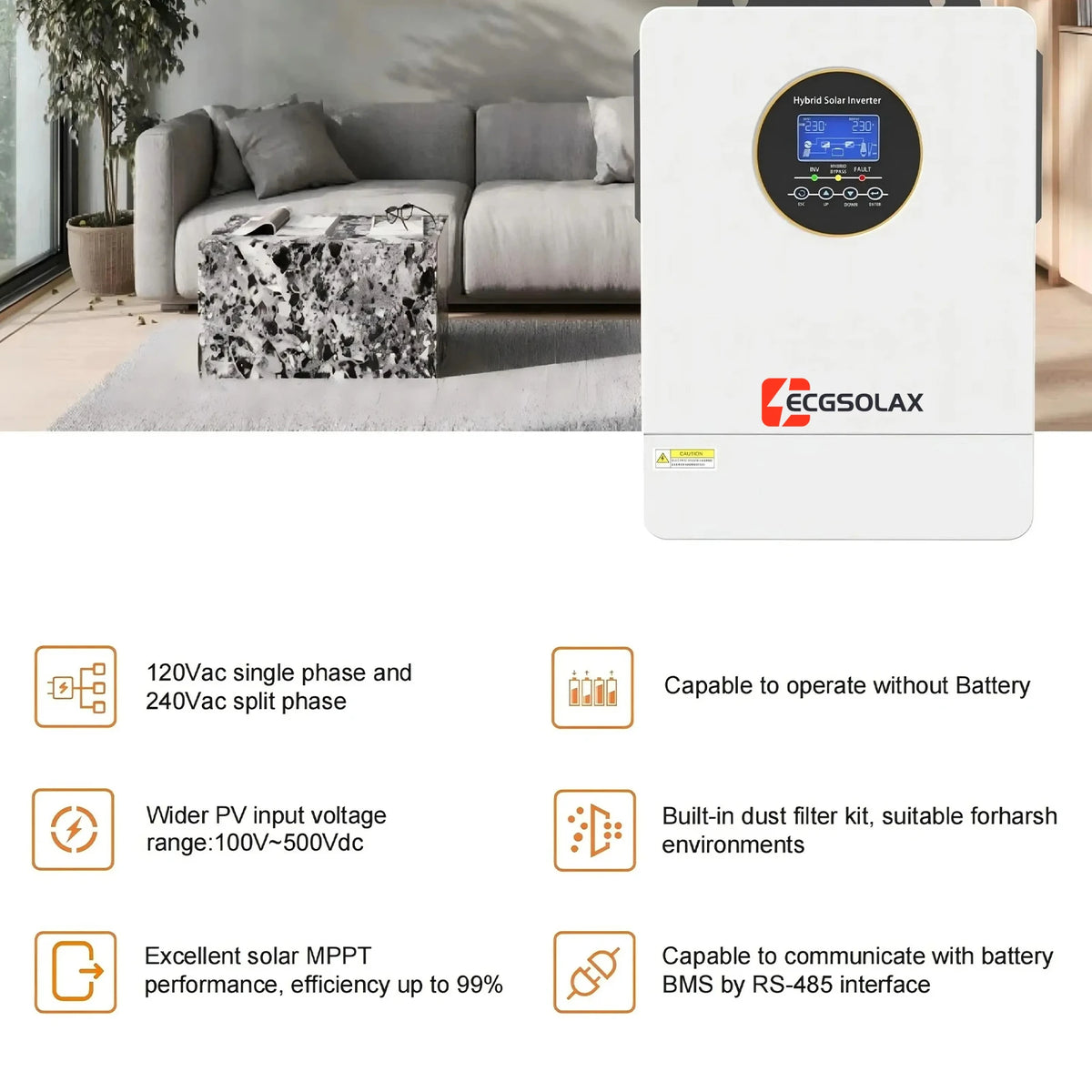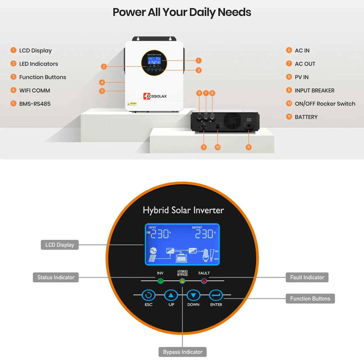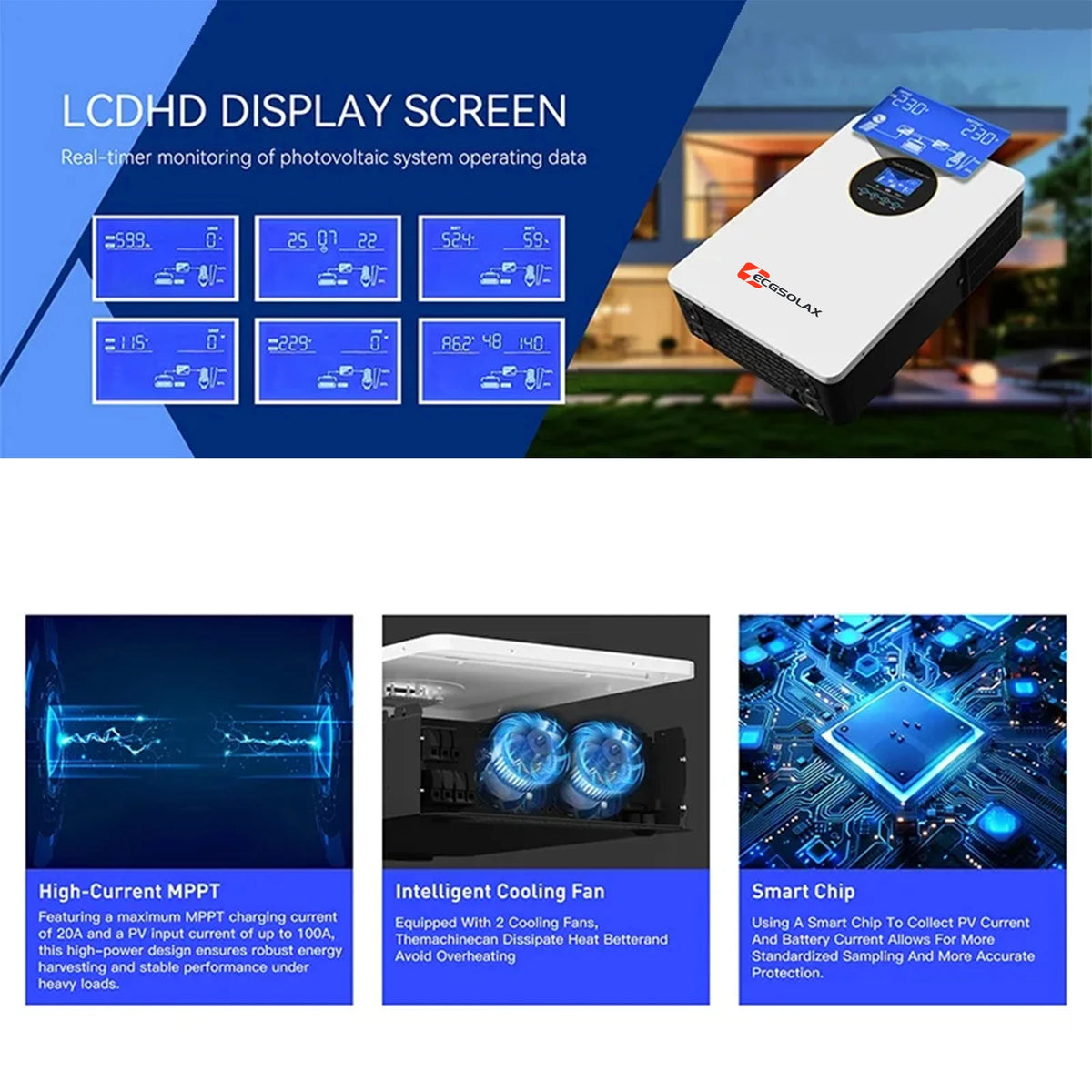 This lightweight 6.5kg Hybrid Solar Inverter features a clear LED+LCD display for real-time monitoring of your solar system's performance. Its wall-mounted design and IP21 protection make it an efficient and space-saving choice for RVs or small utility rooms.