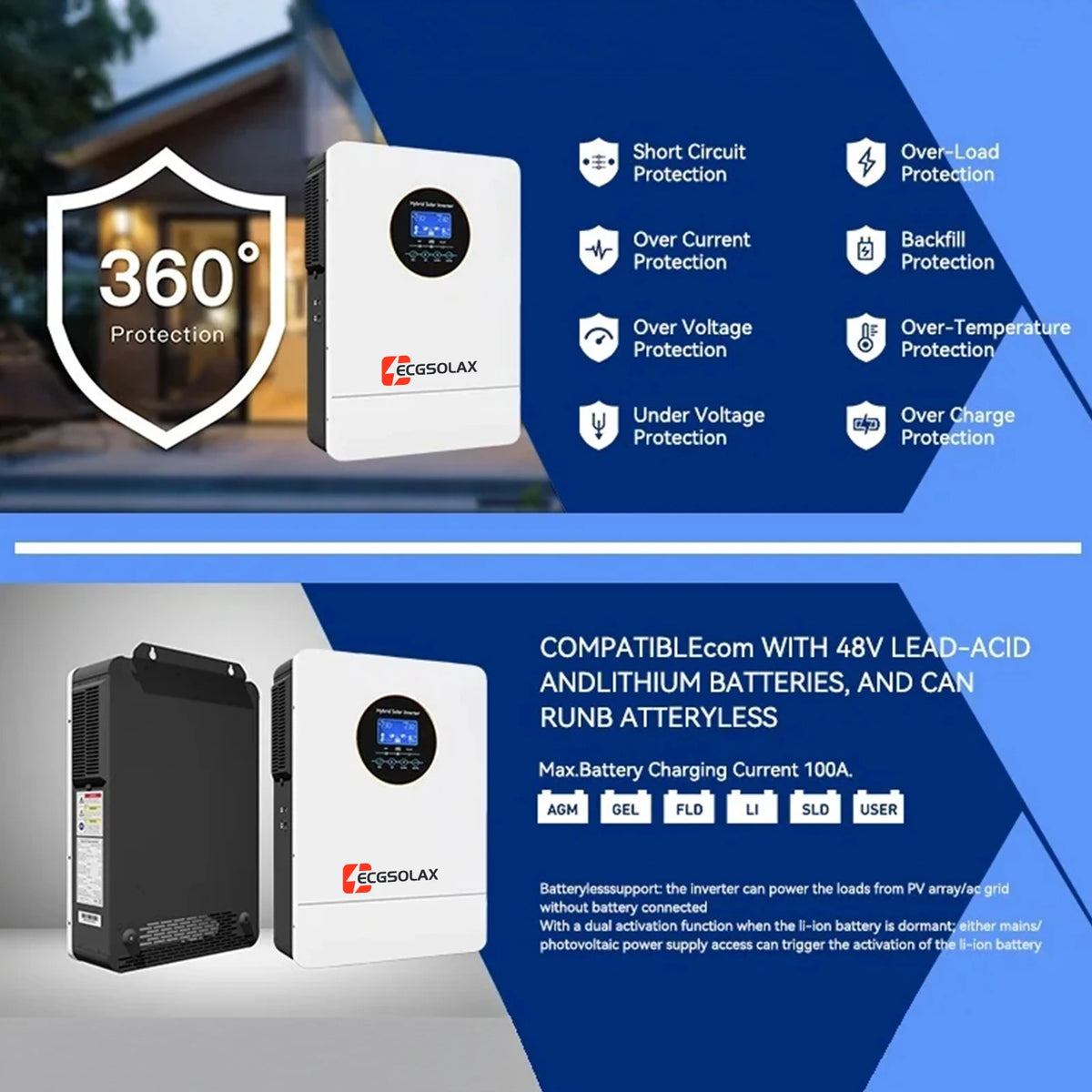 Safety is paramount in this Hybrid Solar Inverter, featuring built-in over-temperature and overload protection. With a peak output power of 4500VA, it easily handles the initial surge of motor-driven appliances like refrigerators or small power tools.