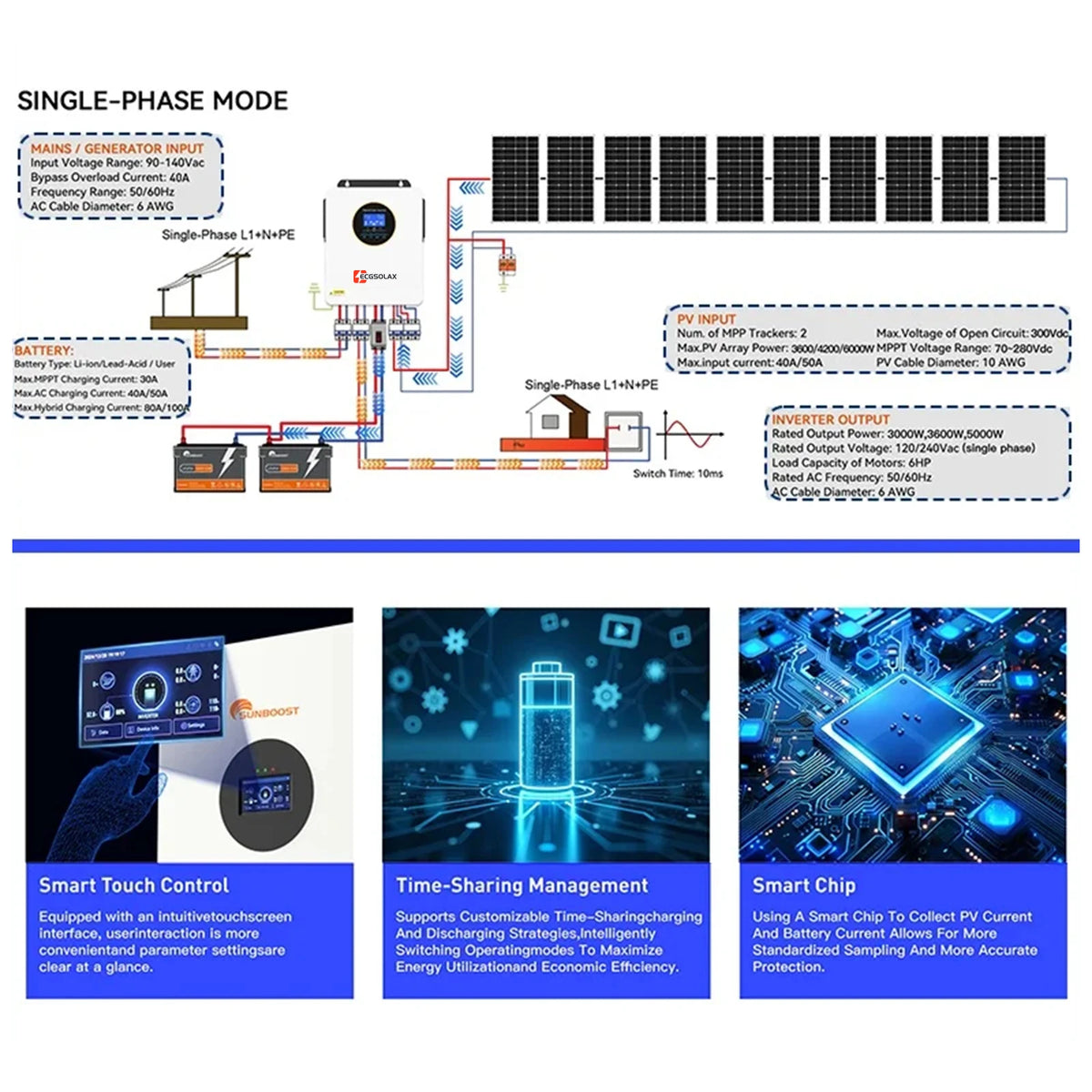 Maximize your energy harvest with this Hybrid Solar Inverter, which supports a massive PV array power of up to 3600W. Featuring a 99% efficiency MPPT controller and a wide 70-280Vdc operating range, it ensures optimal charging performance even in complex lighting conditions.